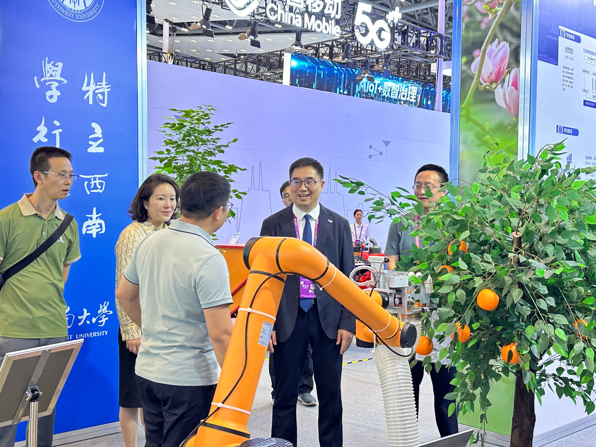 展会期间,重庆市委教育工委书记、市教委主任刘宴兵一行,北碚区委书记林旭阳、区长卓大林一行,公司党委常委、副董事长廖晓衡一行等莅临公司展台考察指导,听取柑橘采摘机器人团队汇报,了解了柑橘采摘机器人的工作原理、技术难点、研发成本及推广应用现状等,并对公司科研进展与成果表示充分肯定。广大参观群众也对公司科研成果展现出强烈兴趣,反响十分积极。
