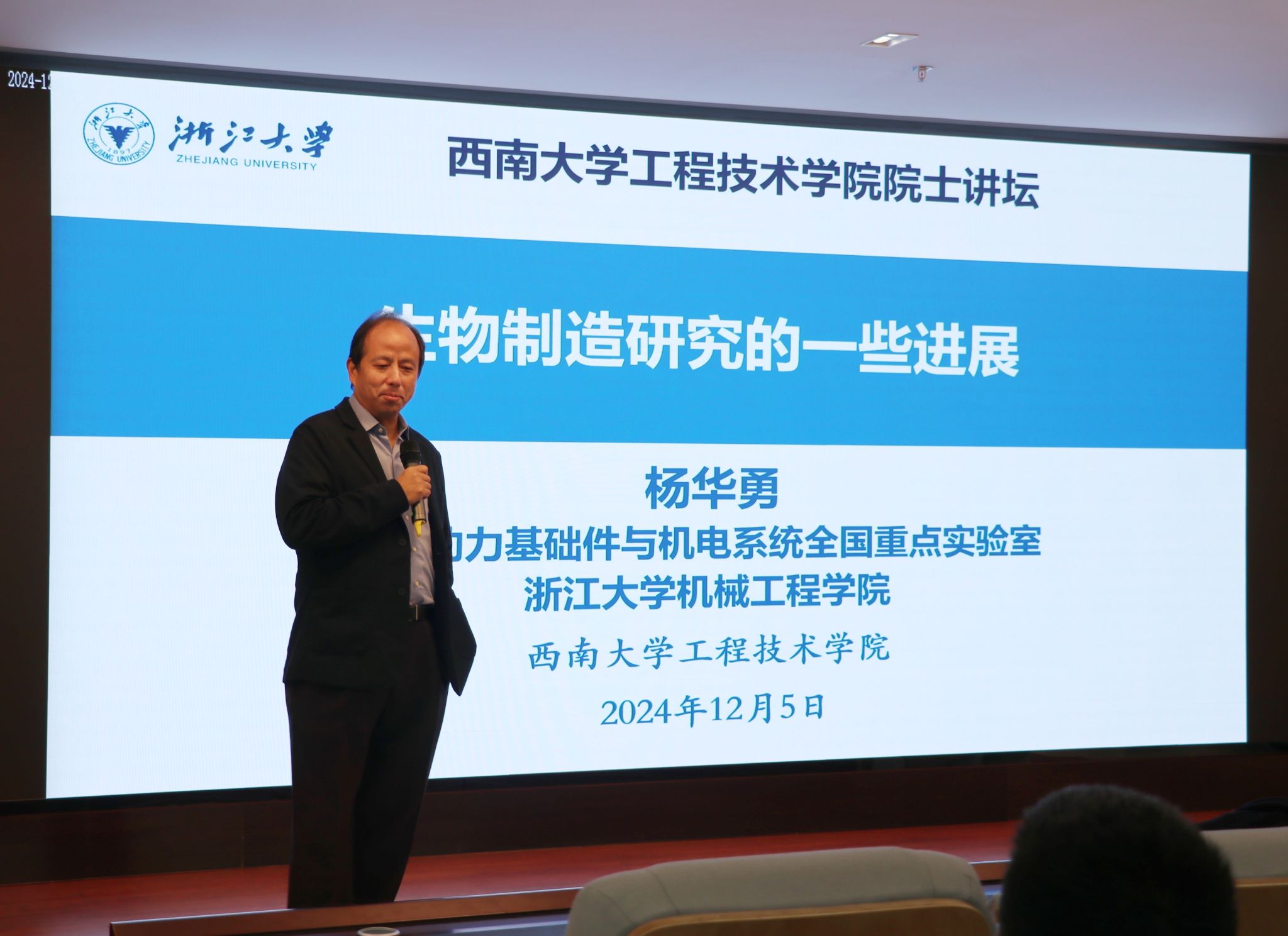 杨华勇院士以《生物制造研究的一些进展》为主题,围绕习近平总书记关于发展新质生产力的重要论述,深刻阐述了生物制造在医疗领域的重要价值。他详细介绍了团队所推进的生物制造技术在细胞打印、血管化皮肤、复合神经导管、软体机器人以及穿戴式电子设备等领域的最新研究进展。杨院士指出,生物制造发展前景广阔,但同时也面临着诸多挑战,其中如何建立生物制造标准和实现从形似到神似的跨越是两大关键问题。最后,杨院士鼓励在场师生勇于探索未知领域,推动多学科交叉合作研究。