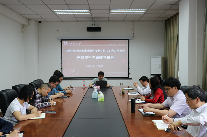 4月28日下午,公司在文俊楼514会议室召开党委理论学习中心组(扩大)集中学习会。邀请公司信息化建设办公室副主任夏大飞作网络安全专题辅导报告,全体理论学习中心组成员、党委委员、纪委委员、支部书记、辅导员、行政办公人员参会,公司党委书记古文海主持会议。